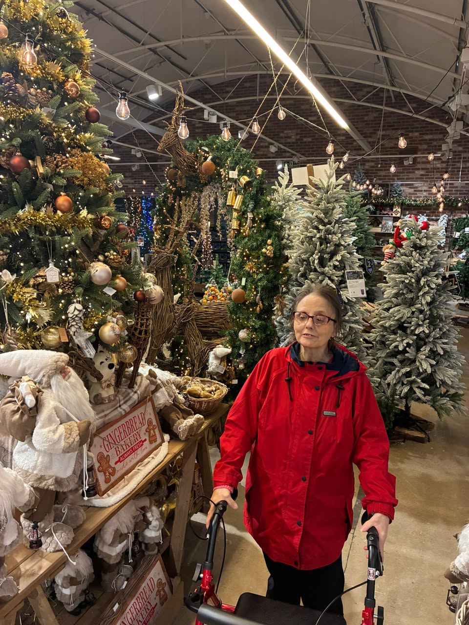 At St Peter’s we always try to make sure that all our residents get the opportunity to go on trips out – sometimes accompanied by staff, and sometimes with family and friends. Here’s a couple of great pictures of our lovely resident, Rosamund, who had a lovely trip to Nottcutts garden centre last week with her family. She really enjoyed her trip out, looking at all the decorations and doing some Christmas shopping.